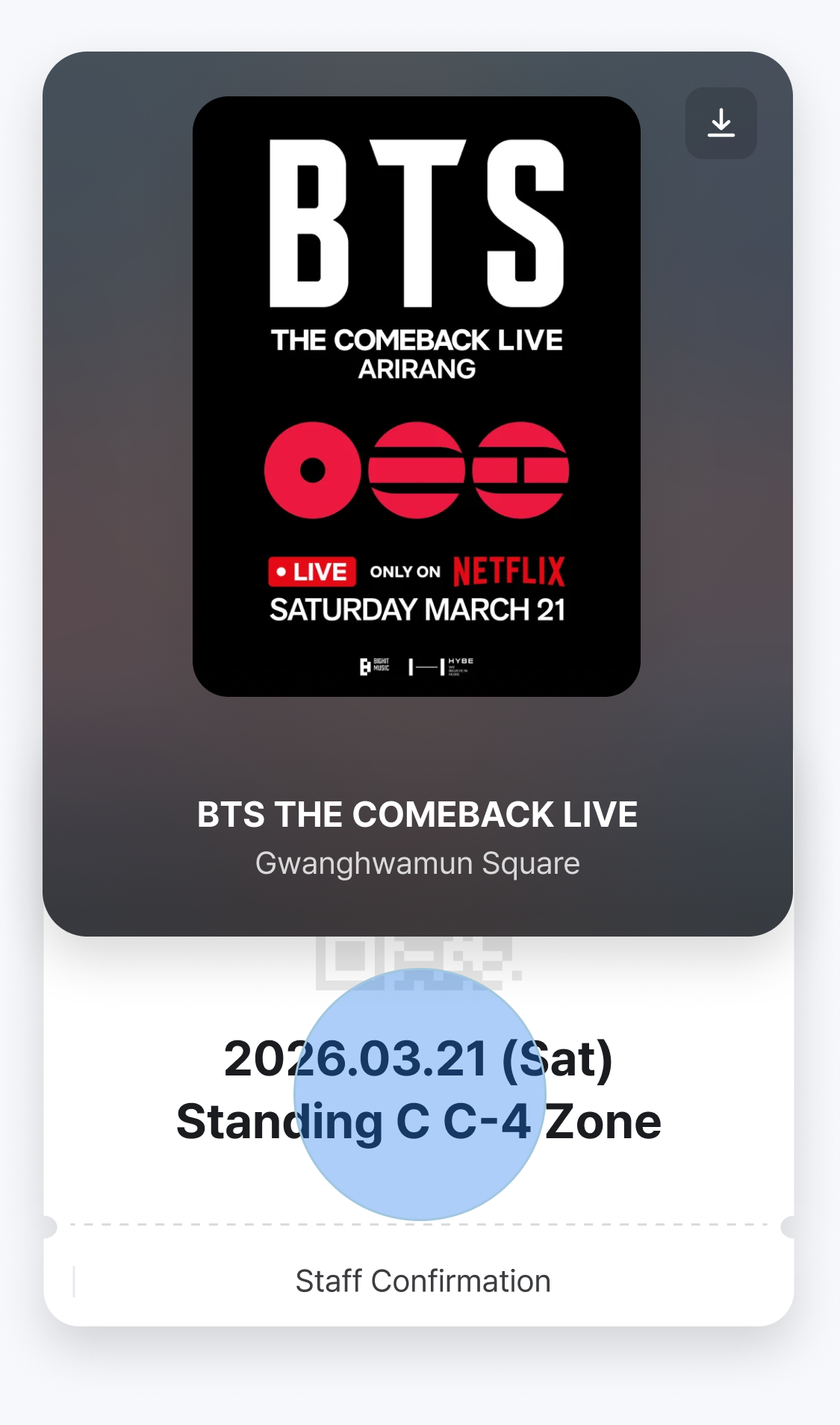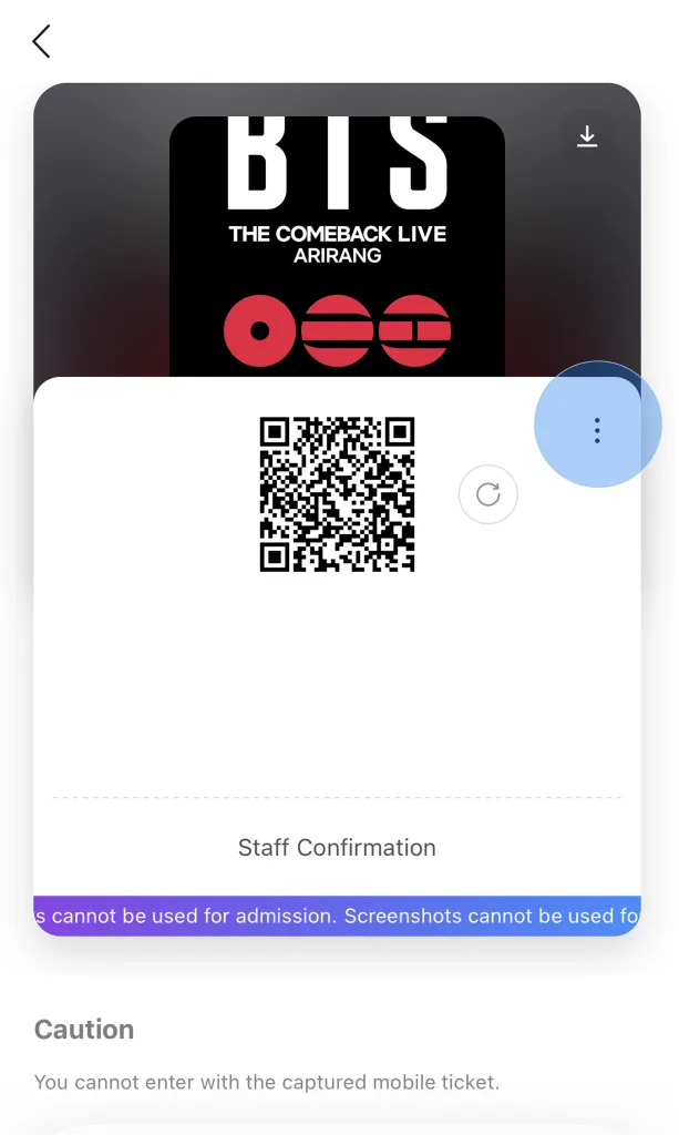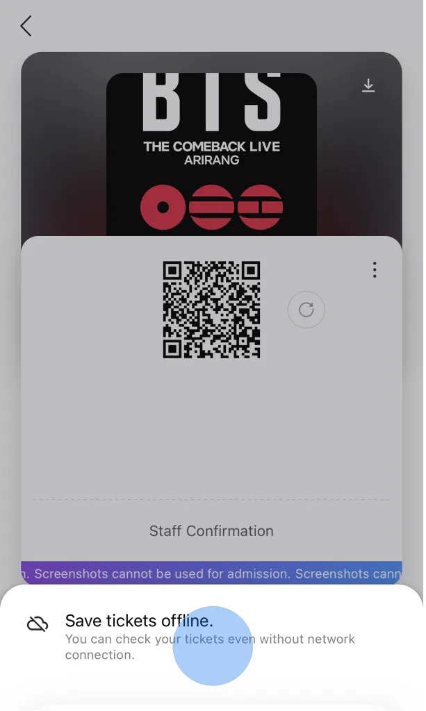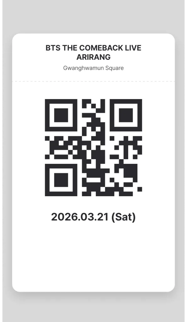 大家好,3月21日在光化门举行的 BTS THE COMEBACK LIVE 演唱会即将到来。演出当天因现场人流极其密集,可能会导致手机网络连接不稳定。为了确保您能顺畅验票及快速入场,强烈建议在抵达演出现场前,提前离线保存入场门票。