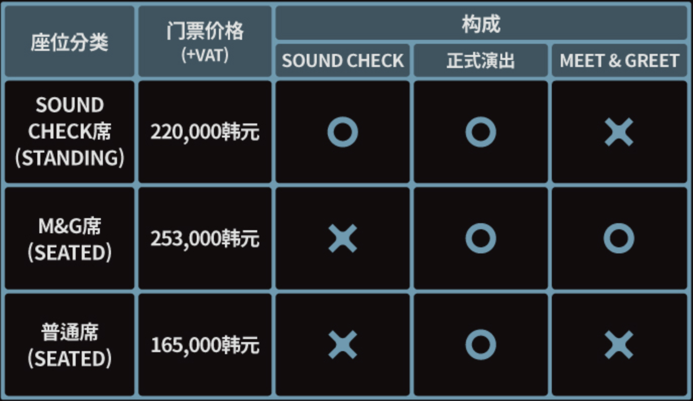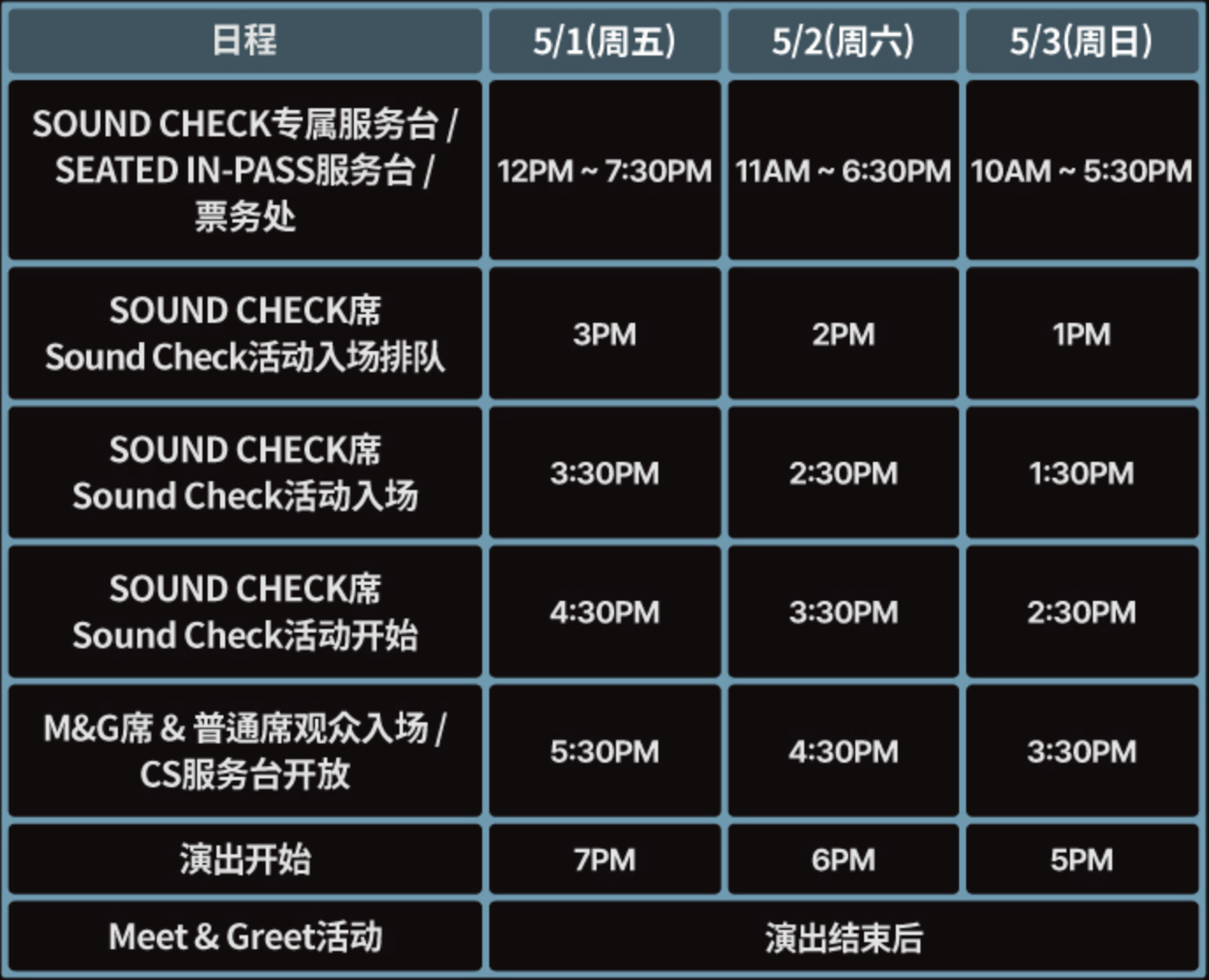 🎶 SOUND CHECK 音响彩排活动在每场演出时间约 2小时30分钟前进行,彩排结束后若离开演出场馆,将无法再次入场;但活动结束后可以使用包括演出场馆内卫生间在内的大厅。 🤝 M&G(Meet & Greet) M&G 活动是在正式演出结束后与艺人打招呼的活动,持续约10分钟。将在每场演出结束且一般观众退场(约40分钟左右)后进行。