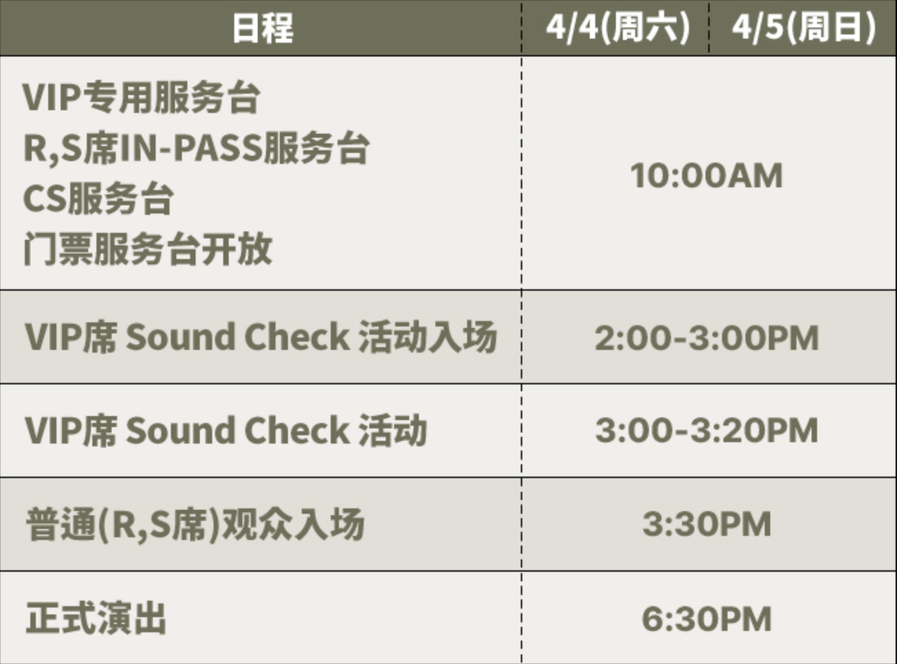 VIP 席及 R、S 席观众的入场时间有所不同,请参考下表。R、S 席可在演出开始前 3 小时开始入场,实际运营时间可能根据当天现场情况有所变动。
