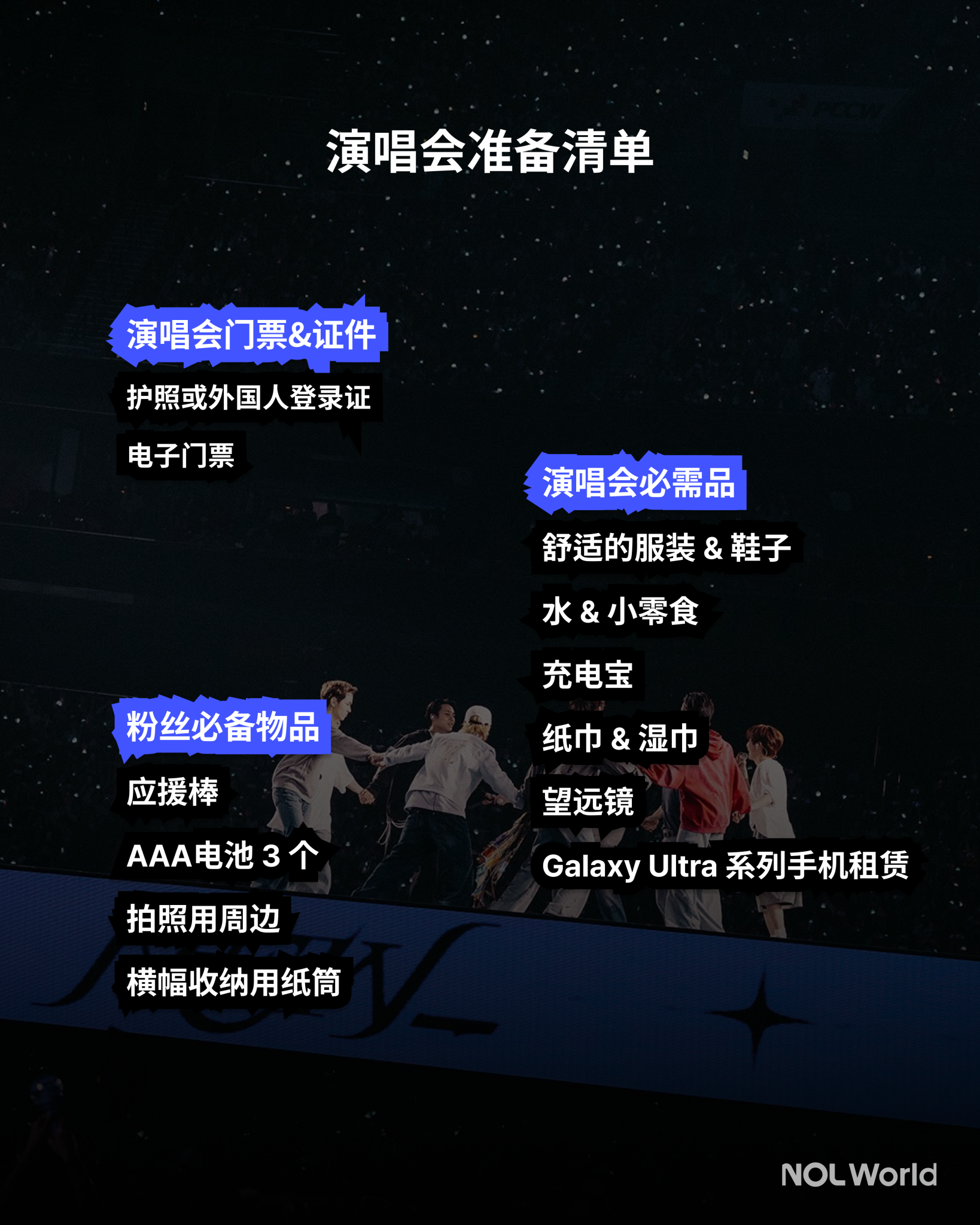 别忘了带上身份证、应援棒和电池。为了拍纪念照,建议带上小卡、玩偶等周边。若座位较远,望远镜也是不错的选择。有了这份清单,就算是准备完成啦!✨此外,因仁川亚运会主体育场为露天场馆,建议提前准备好保暖衣物以维持体温,并携带雨衣以备不时之需。