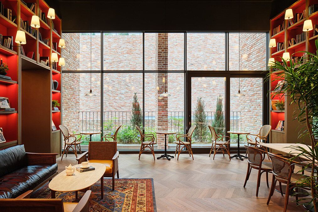 早午餐咖啡厅,以红色书架和露台营造异国氛围