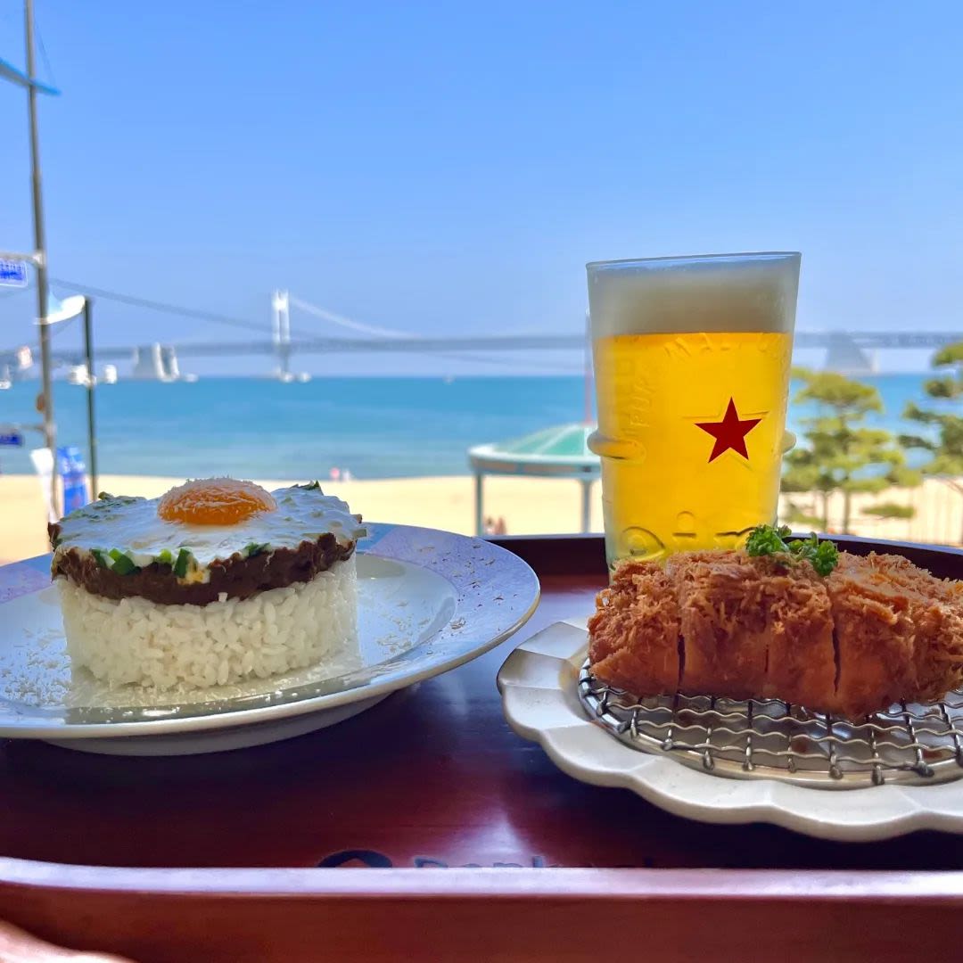 炸猪排美食店,可以边吃边欣赏广阔海景和海水浴场
