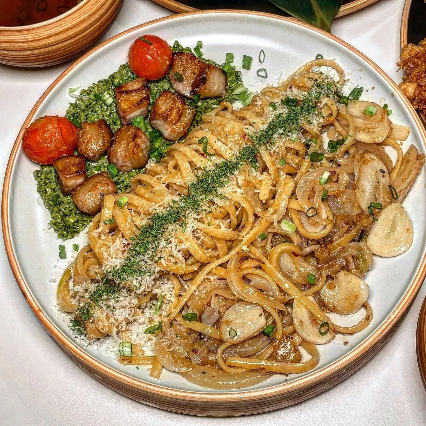 猪颈肉茖葱橄榄油意面