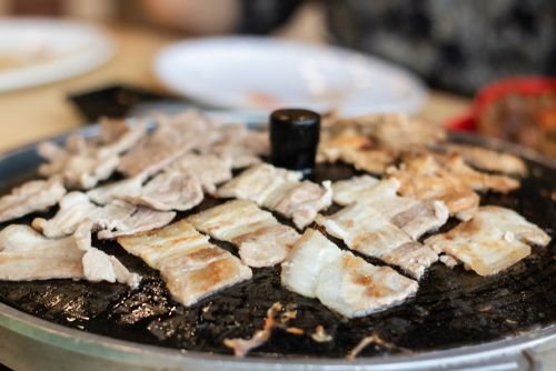 烤肉店,适合在宽大的锅盖上烤五花肉、辛奇(泡菜)和豆芽