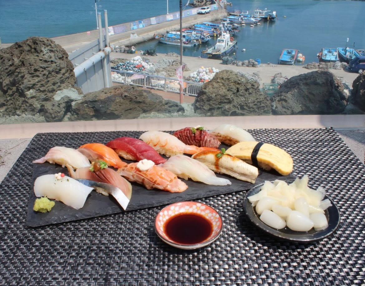 日式餐厅,在可观赏海景的餐桌上品尝寿司套餐