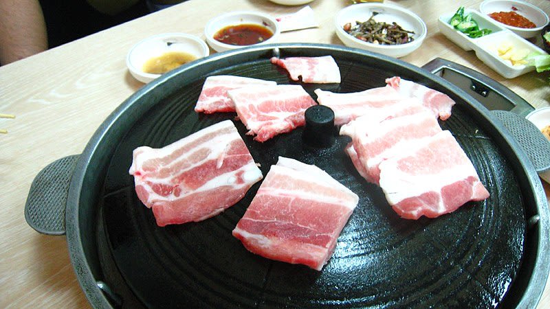 肉类店,可在老式锅盖上烤制厚厚的生五花肉