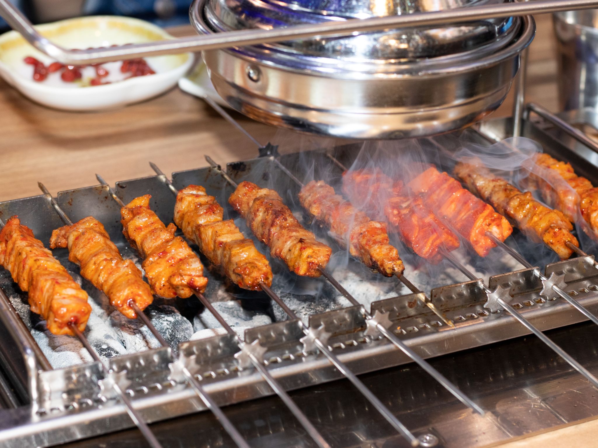 美食店,在炭火上慢慢烤制的羊肉串,适合配以啤酒享用