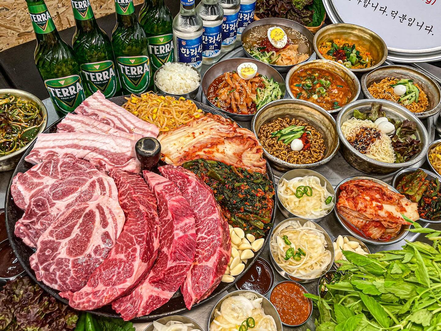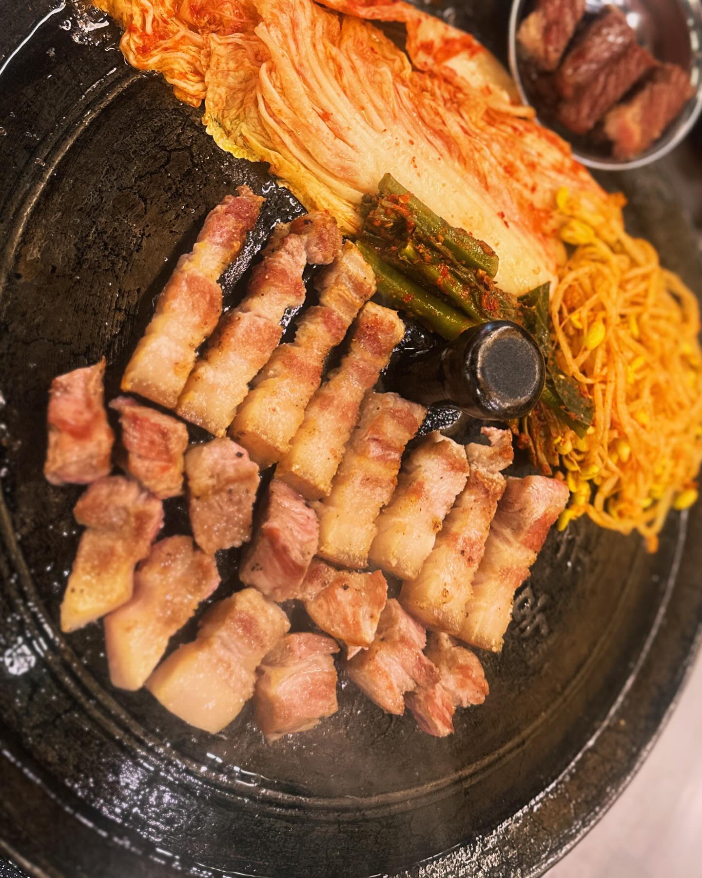 在大锅盖上烤五花肉和水芹的烤肉店