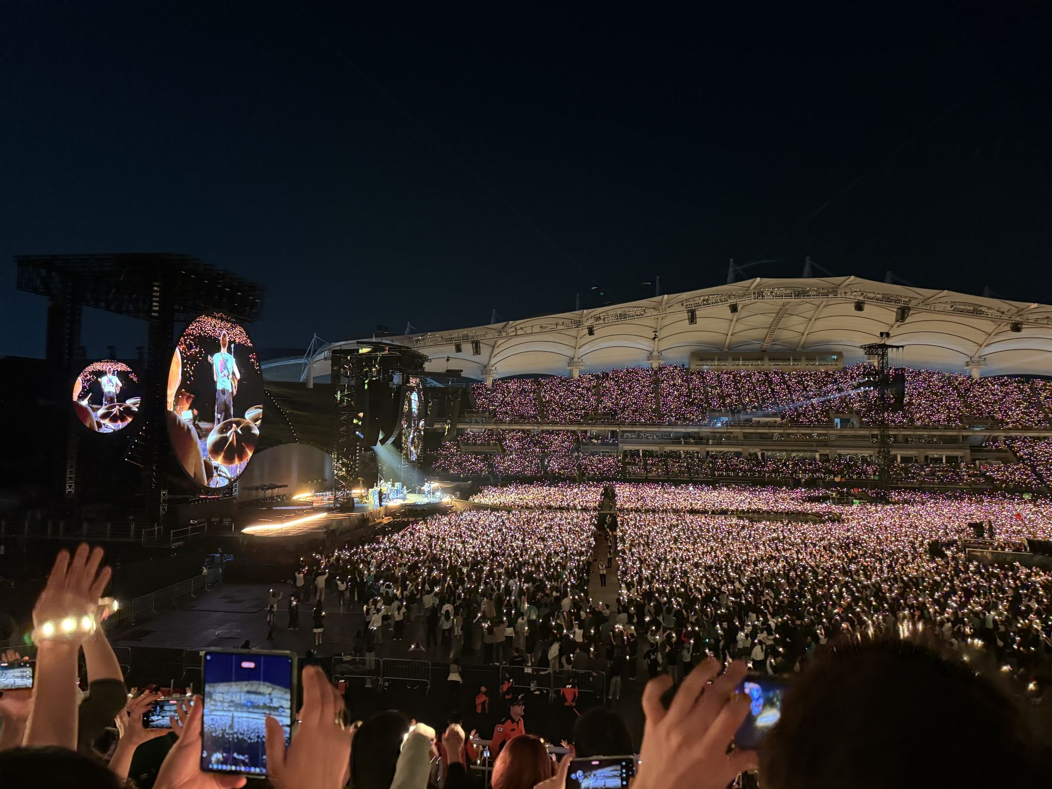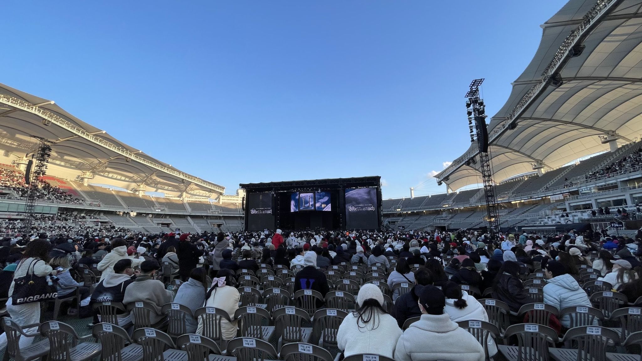 观众席安排在一、二楼,体育场呈现椭圆形,如果在南方设置舞台,北方的座位离舞台最远。另外,东侧、西侧座位上方有遮蔽的屋顶,而南侧、北侧区域座位上方没有屋顶。