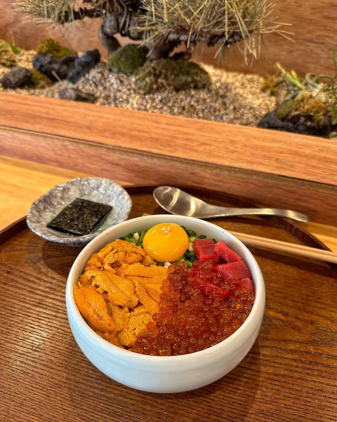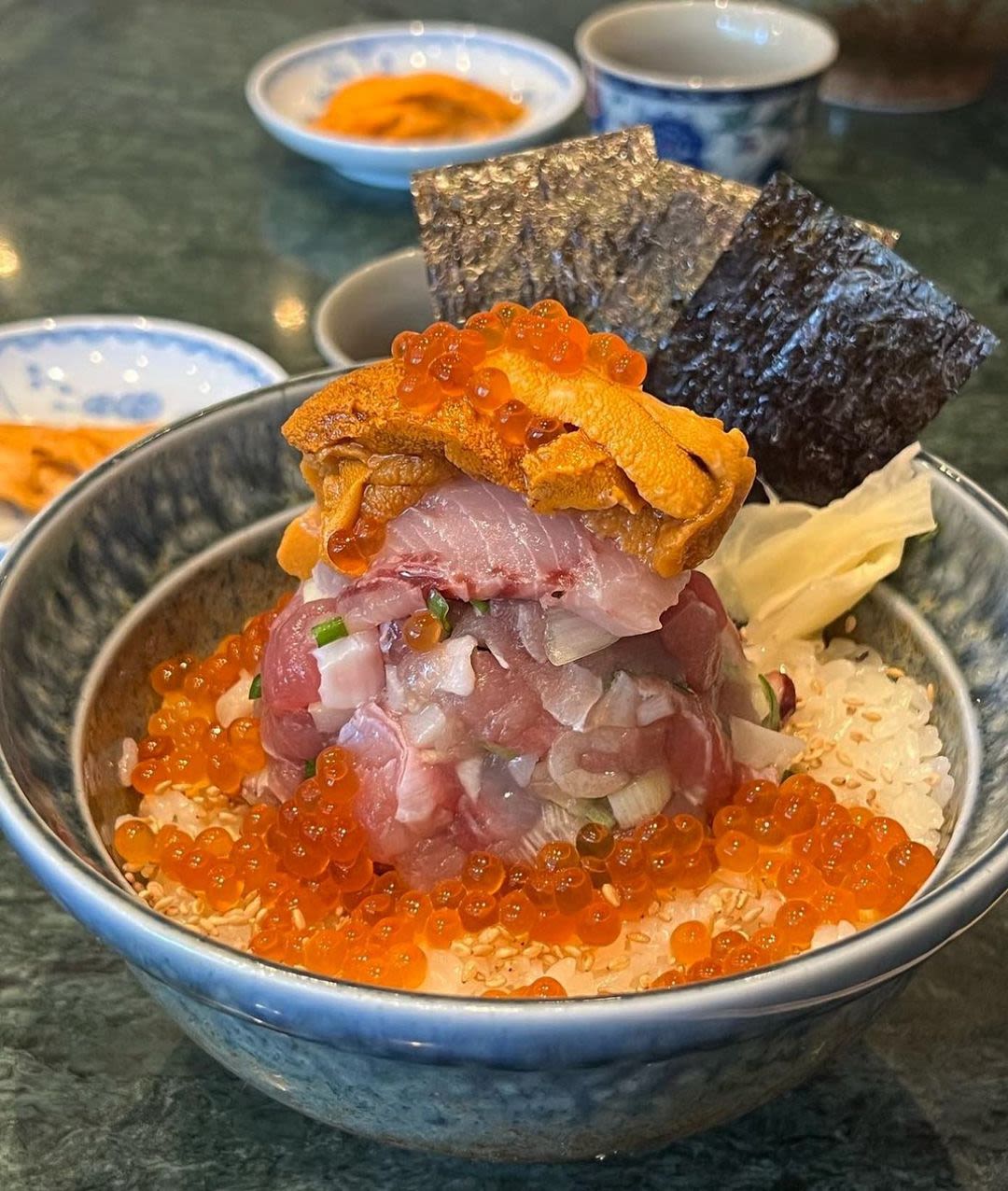 米饭上放海胆、金枪鱼和三文鱼籽的盖饭