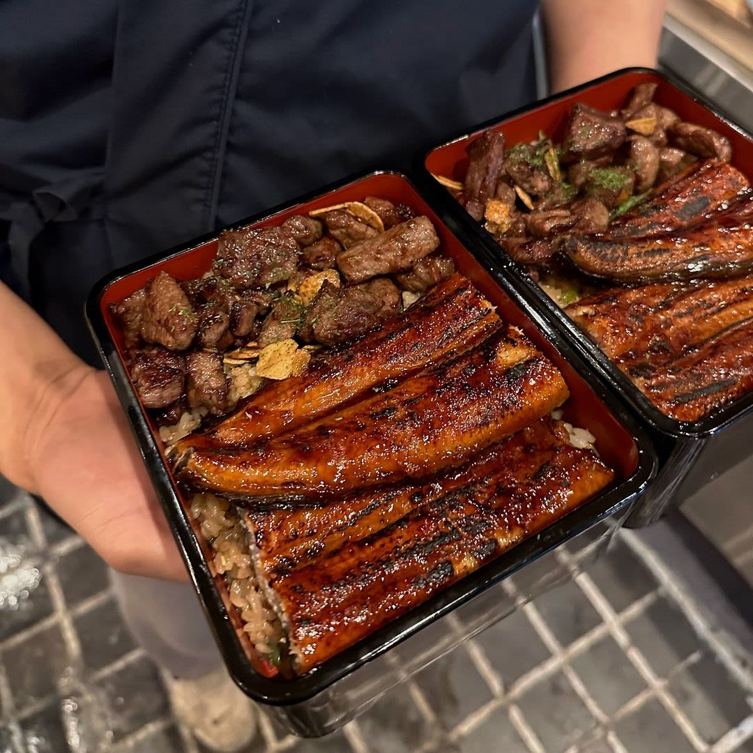 米饭上放方块板腱肉和整条鳗鱼的盖饭
