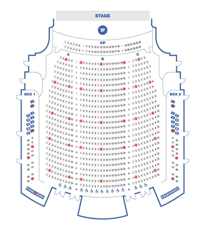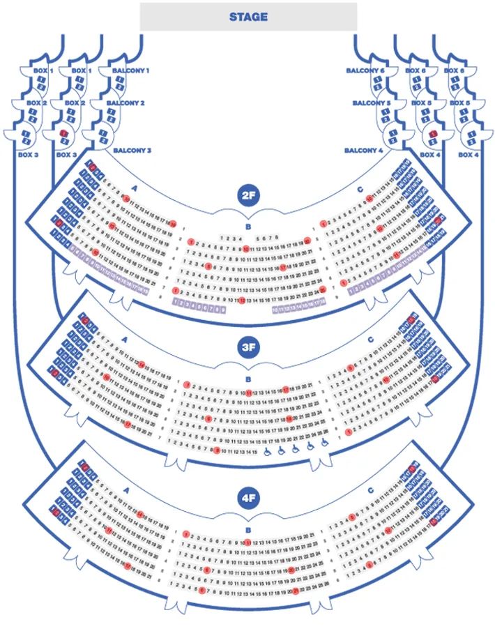 客席共分 4 楼,呈环绕舞台的形式排列。舞台两侧设有包厢式座位。剧场设计精妙,确保声音能均匀地传达到客席的每一个角落。 1 楼座位可以近距离感受演出的生动感,而高层座位则适合俯瞰舞台全景。不过,根据座位位置的不同,部分视野可能会受到限制 (视线受阻)。各区域的具体视野可通过下方链接确认。