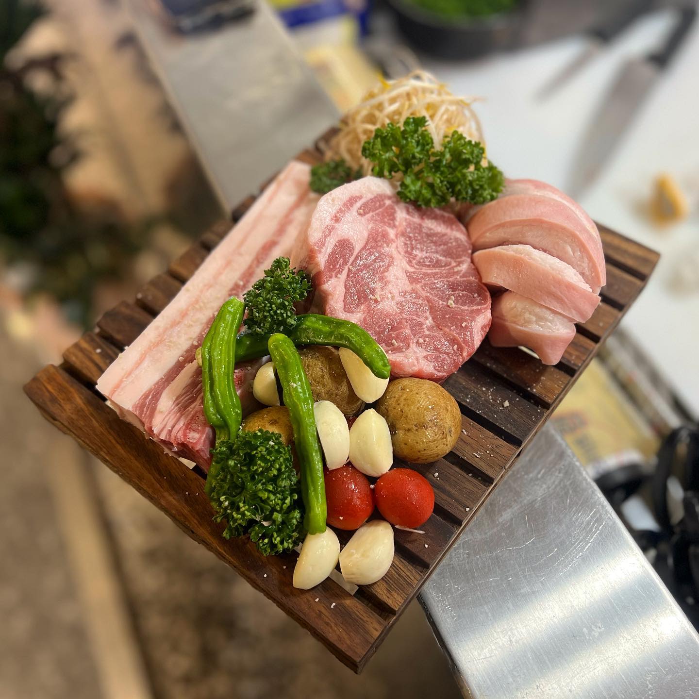 由排骨、猪颈肉、鸡蛋卷等组成的套餐