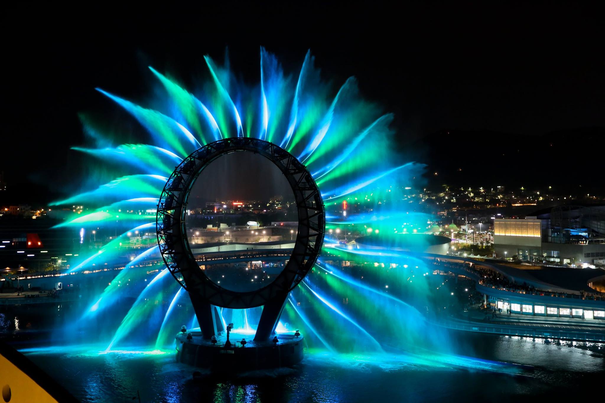 47米高的圆形雕塑“THE O”、最高可达70米的喷泉、光束投影、炽热火柱和激光等元素,在夜幕中营造出梦幻般的视觉盛宴。演出包括伴随甜美古典乐水柱舞动的“海上喷泉秀”、讲述丽水少女“哈娜”海底故事的“哈娜秀”、以及主角“蒙奇”的单人秀“蒙奇秀”三大主题,历时约45分钟。众多特效无一差错地点缀美丽丽水夜海,为游客带来独特乐趣。