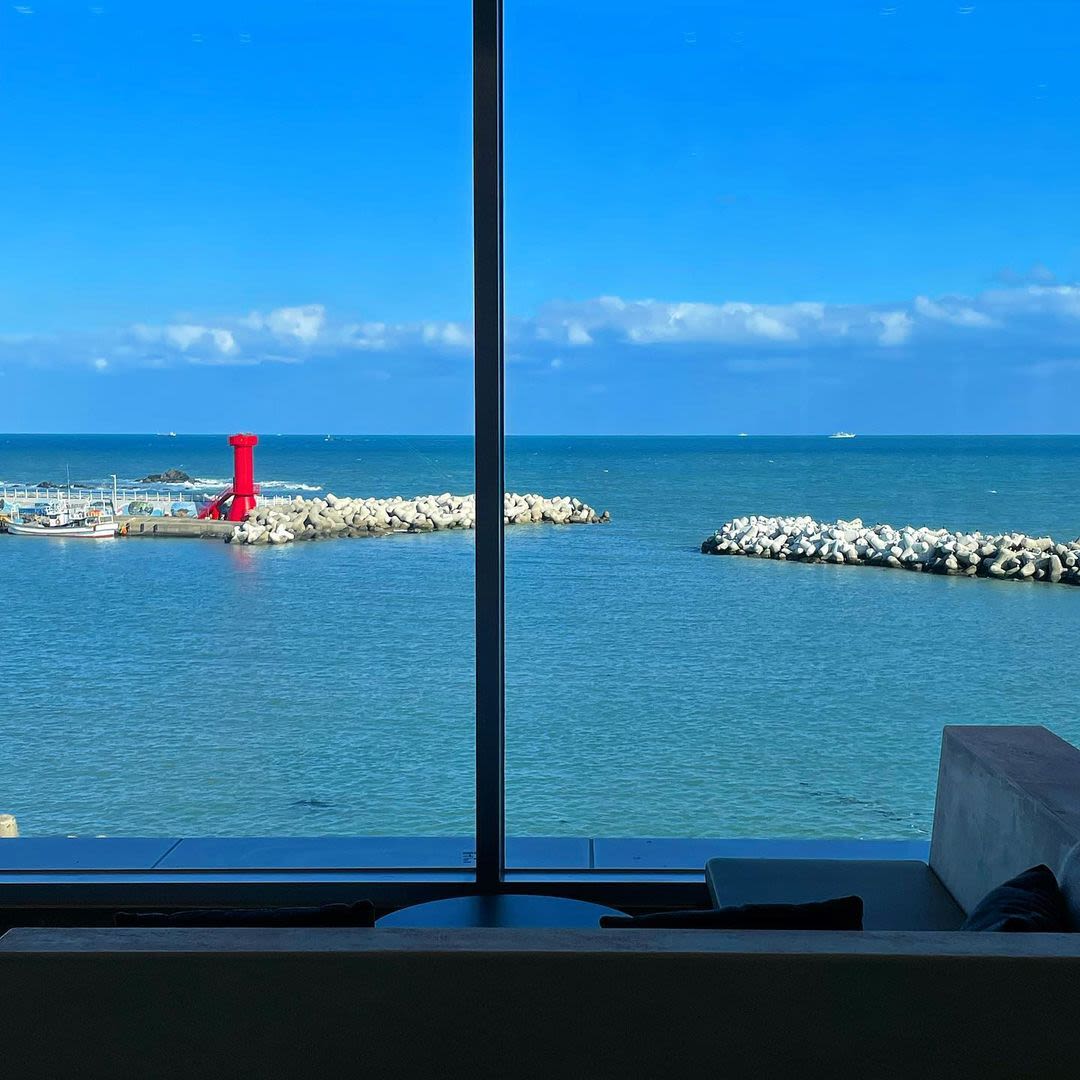 大型面包咖啡厅,从大玻璃窗能看到如画的海景