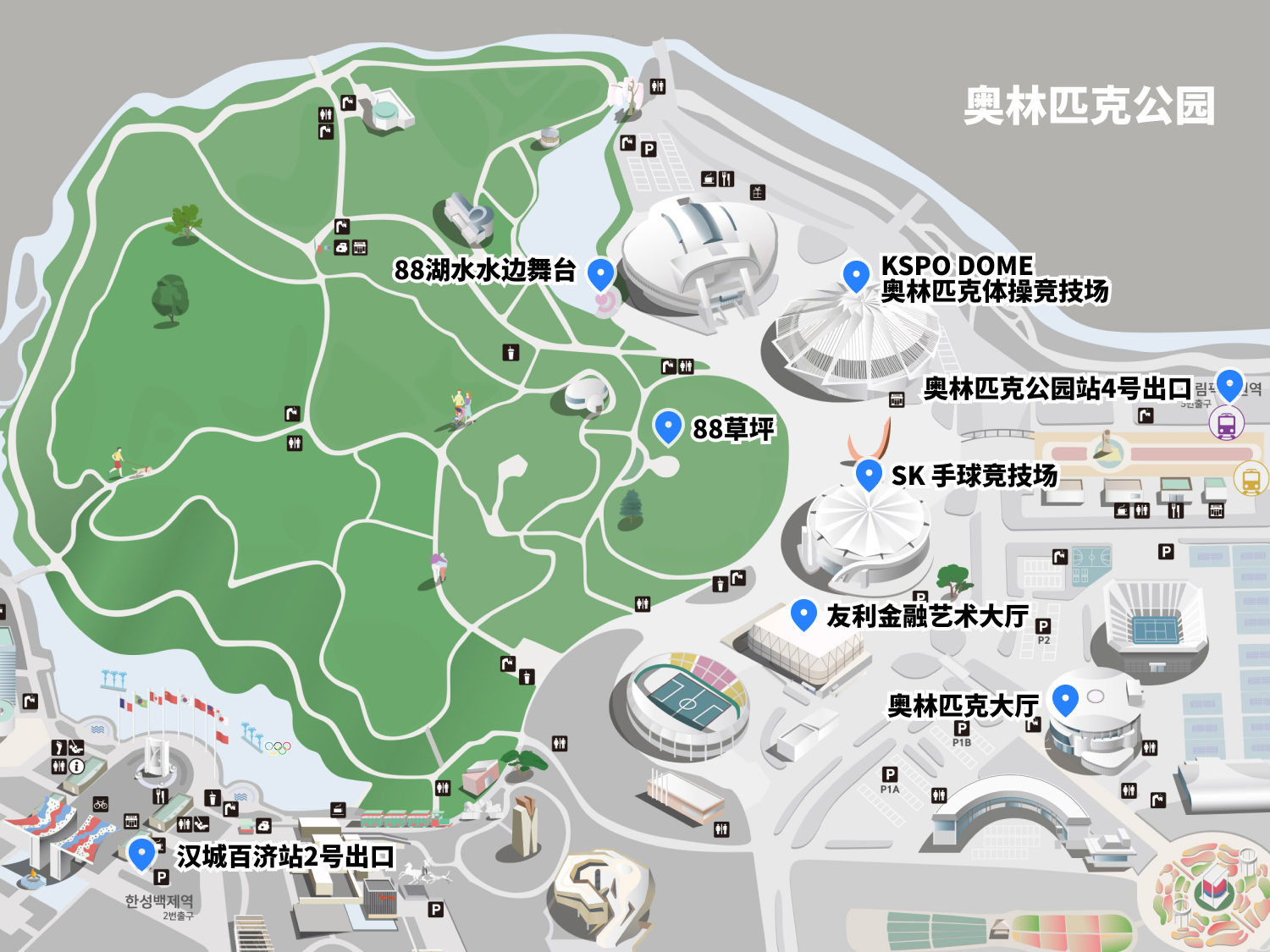 奥林匹克公园周边除了5号线、9号线奥林匹克公园站外,还有9号线汉城百济站、8号线梦村土城站。如果想避免演出后拥挤的奥林匹克公园站,可以选择前往周边其他地铁站。