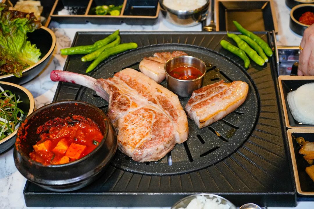 炖鳀鱼拌饭和厚实的黑猪五花肉搭配良好的烤肉店
