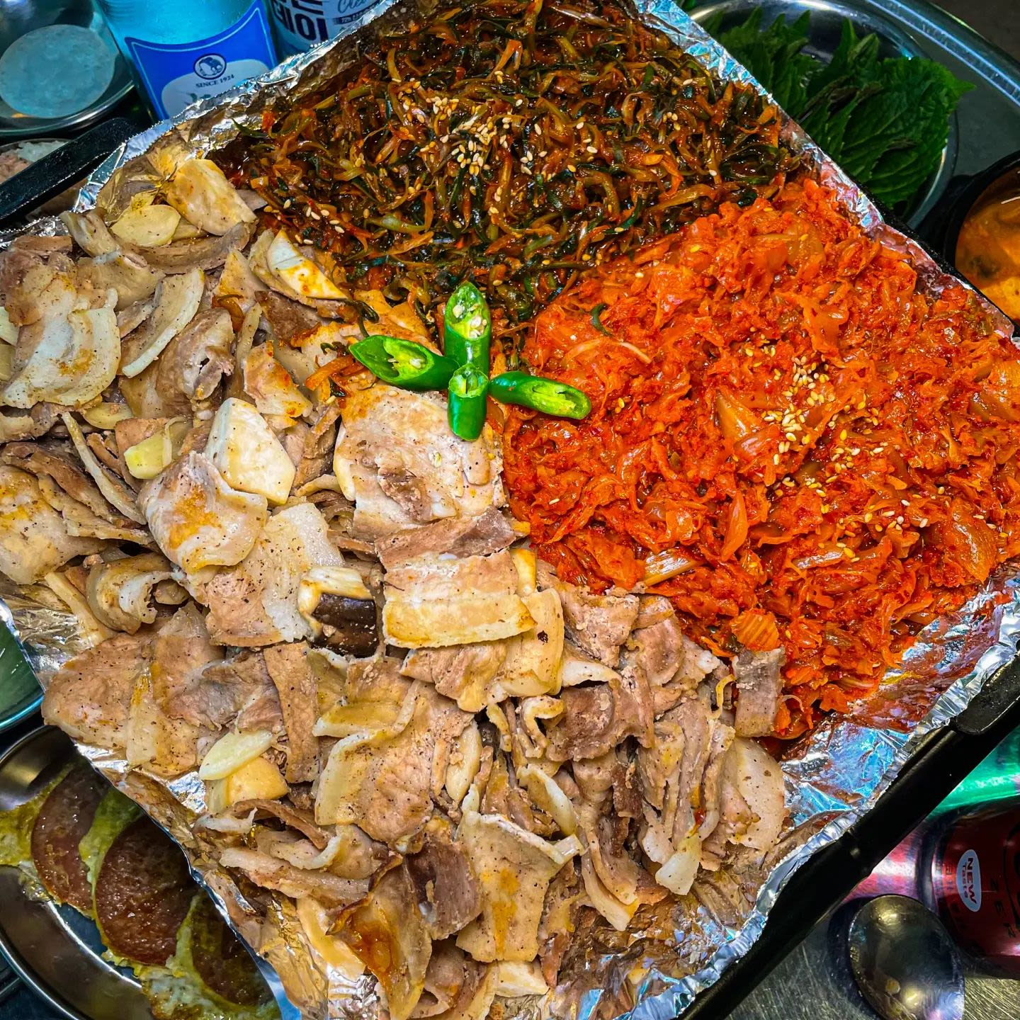 复古氛围感烤肉店,烤五花肉与辛辣葱拌菜的完美搭配