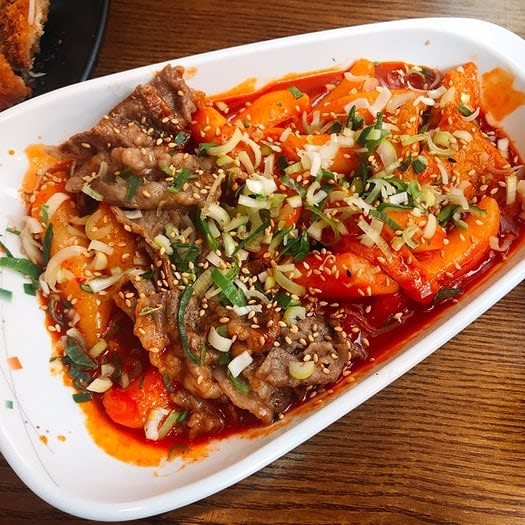 小吃店,以牛肉年糕炒和蟹肉紫菜包饭为特色