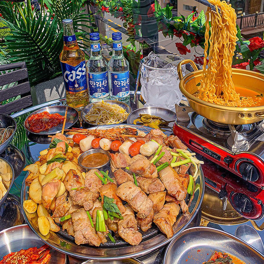 露营风餐厅,猪肉配土豆、虾、串等的拼盘为特色菜品