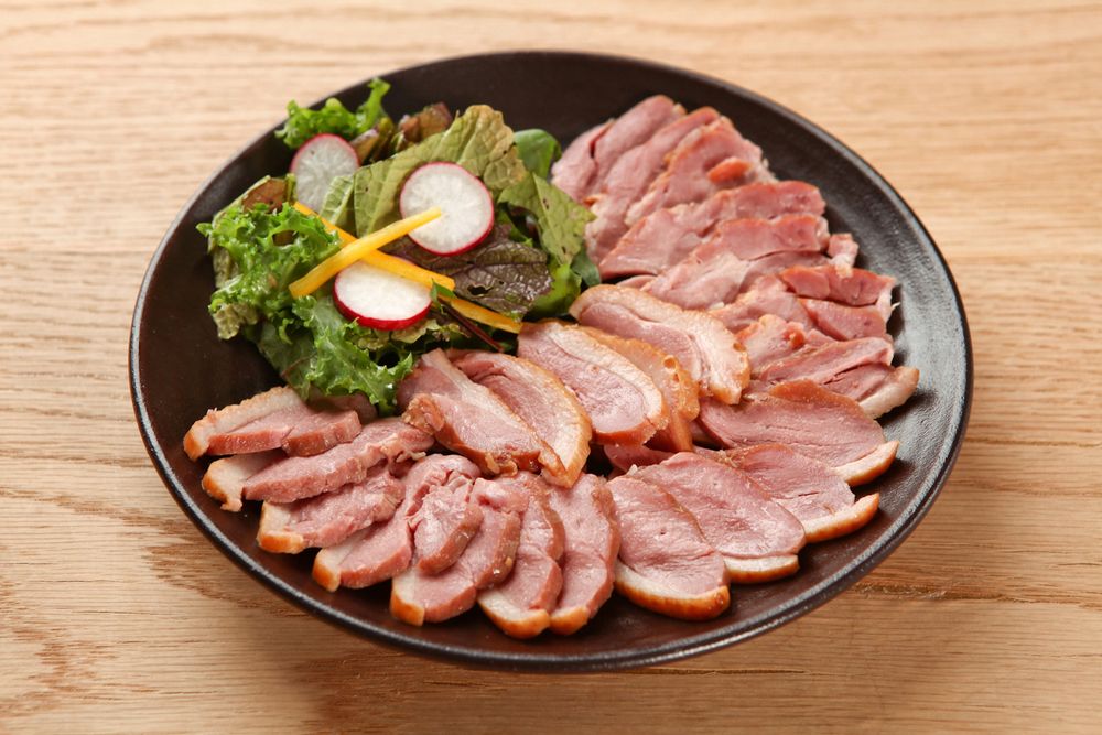 火锅美食店,提供带苏子叶和韭菜的熏鸭火锅,适合包裹食用