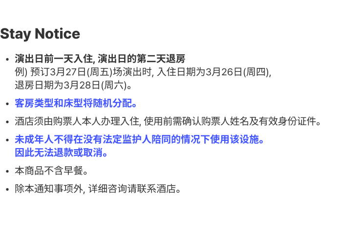 • 住宿和演出取消将同时进行,不可部分取消。