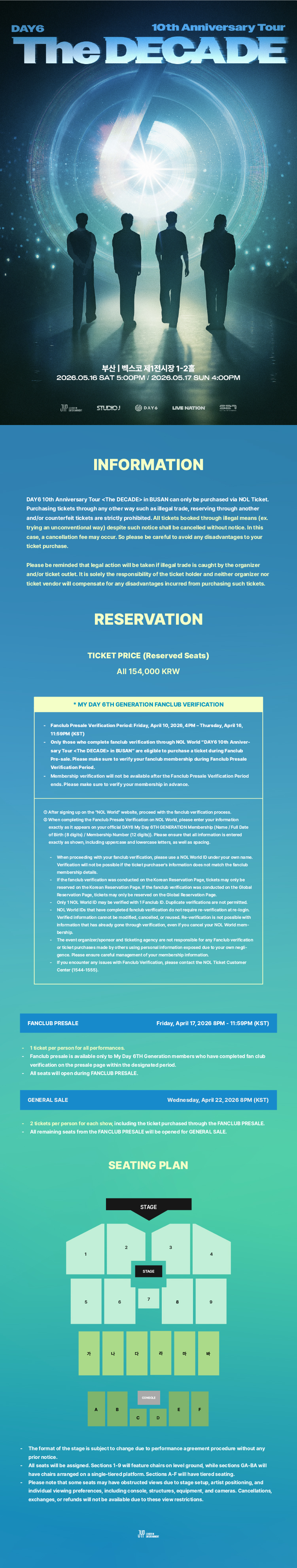 ※ According to the terms on the notice of this concert, ticket reservations will be canceled for cases where abnormal or fraudulent methods(e.g., using a macro program, etc.) have been detected in the ticket purchasing process. If fraudulent ticket activity is suspected, the reservation holder may be required to undergo on-site ID verification and additional screening. Any fan club member found to be involved in illegal ticket transactions will face immediate disqualification from My Day 6th Membership and will be banned from joining future membership terms.