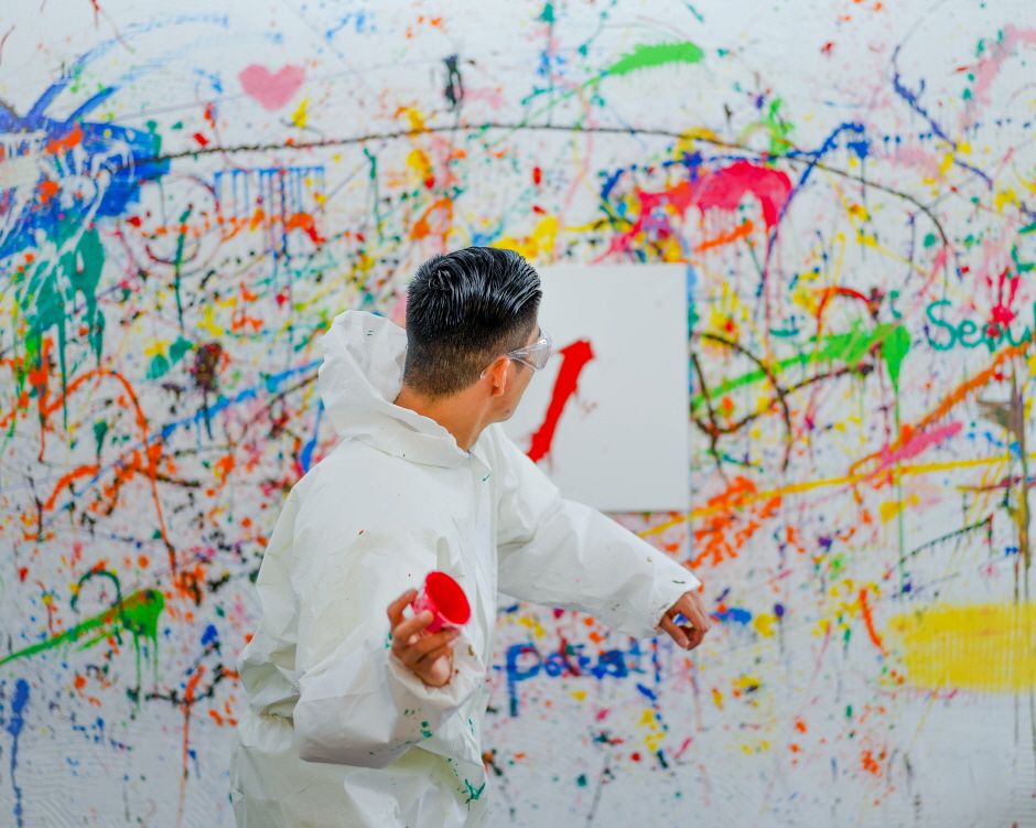 圣水动作彩绘体验,穿防护服在画布上自由泼洒颜料,释放压力并创作专属艺术品,是极具拍照感的热门活动。