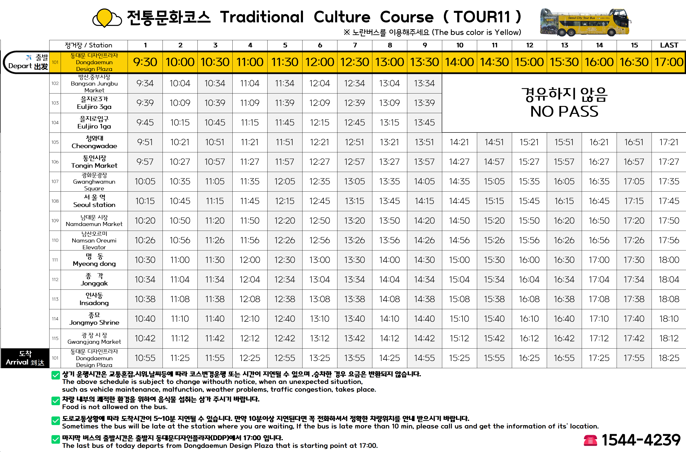 親子、子供、友達と一緒に乗るともっと楽しいYellow balloonシティツアーバス! '天井開放型'の名物2階建てバスに乗ってソウルを一望してください!ソウル都心の見どころだけを選んで見る東大門シティツアー'伝統文化コース'を通じて、ソウル歴史遺跡、ソウル市内の名所など2階建てバスの上から新しい世界、新しいソウルを見ることができます。都心で楽しむ2階建てバス自由旅行!涼しい風を感じながらソウルを観光したいなら、Yellow balloonシティツアーバスに乗ってソウルの観光名所を快適に移動してください。 • 乗車券を1度購入することで、出発地またはすべての停留所で乗車回数に関係なく自由に乗り降りが可能、1日無制限で利用することができます。 •ショッピングの中心地である東大門から出発するので、ショッピングの後に何をしようか迷っているなら、バスの上で気軽にソウルを観光してみましょう。 • ソウルで最も有名な畜産市場から韓薬材市場、東廟など、他の場所では見ることのできないユニークな観光地も訪れることができます。訪れることのできる観光地関連情報を確認する場合は HERE! ▶コース紹介 1.市場 市内の中心に位置する南大門市場、広蔵市場、芳山市場などの大型伝統市場を訪れてみてください 2. 歴史遺跡地 景福宮、徳寿宮、雲峴宮、崇礼門(=南大門:国宝1号)、興仁之門(=東大門: 宝物1号)、ユネスコ世界文化遺産"宗廟"、鐘閣、大韓民国歴史博物館、古宮博物館、韓国民俗博物館などに停車いたします。 3. ソウル市内名所 ソウル駅、伝統文化通り仁寺洞、タプゴル公園、ソウル市庁舎、市庁広場、大統領執務室大統領府、ソウルの中心地である光化門広場、明洞、国内最大の衣類通り、小売ショッピングタウン東大門大型商店街、ショッピングタウン密集地域、東大門デザインプラザ(DDP)、都心の位置する河川である清渓川、若者通り鐘路と乙支路、光化門通りなどソウル都心の伝統市場と歴史遺跡などを2階建てバスで循環運行致します。