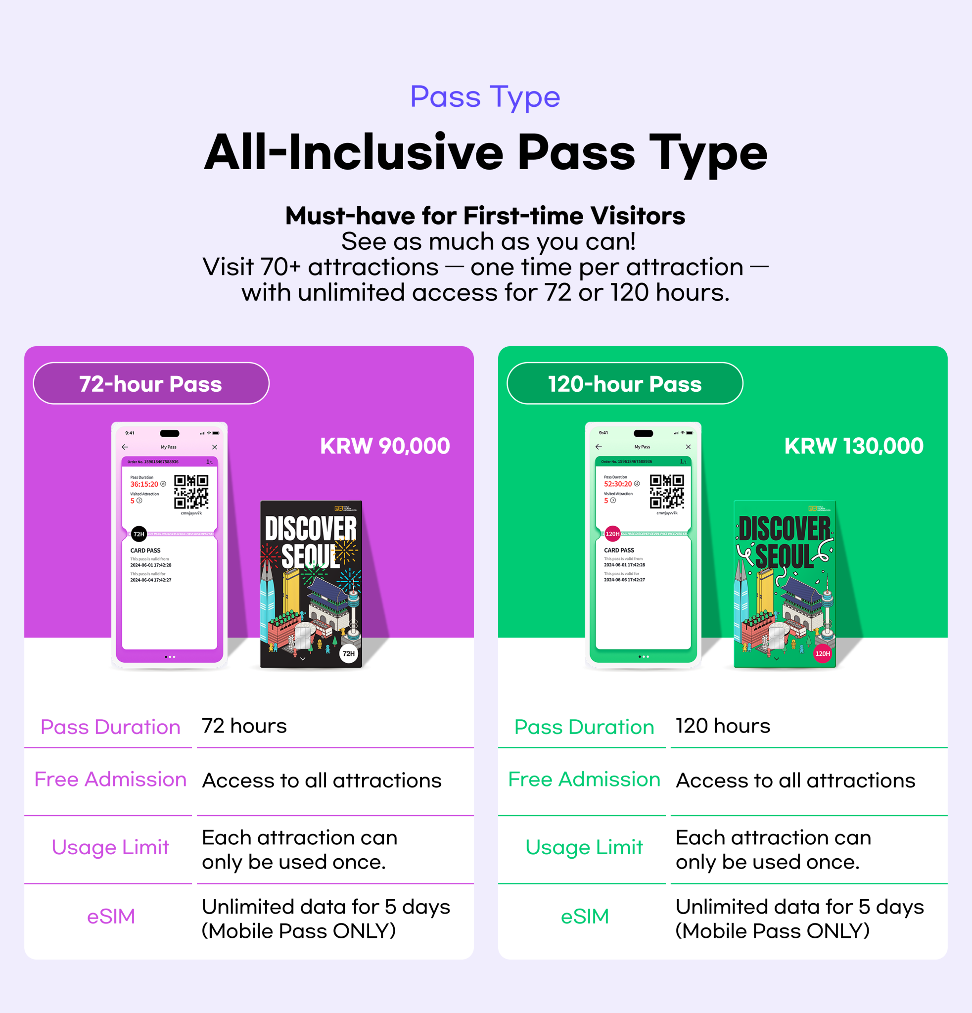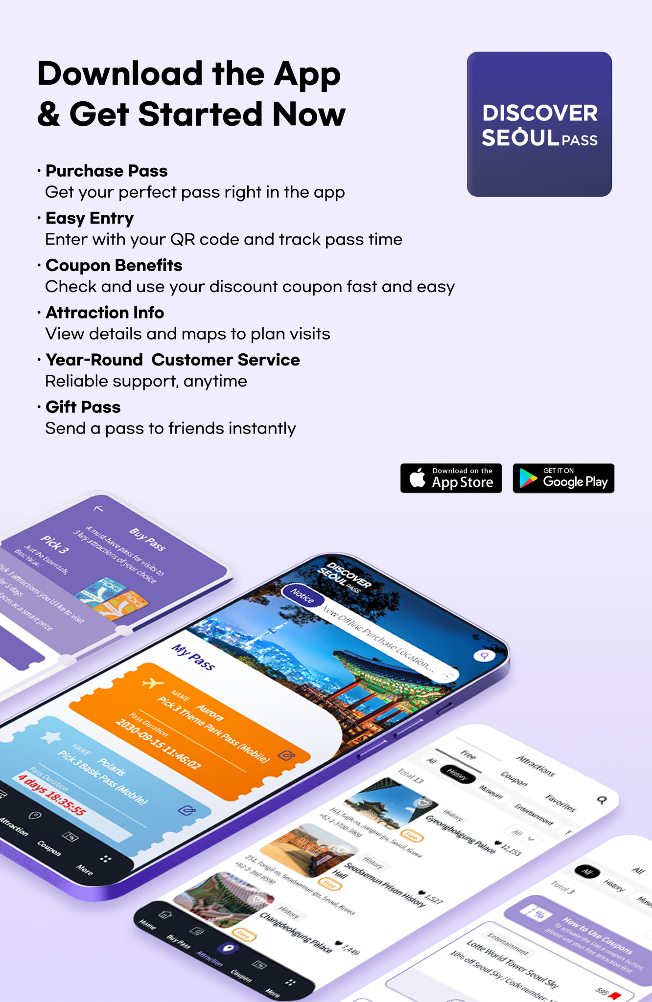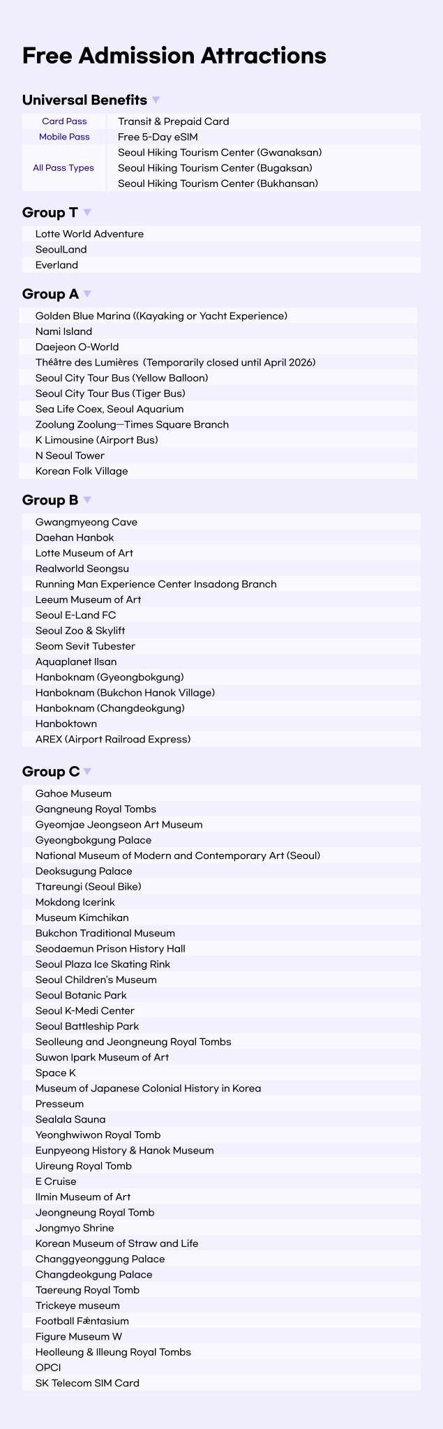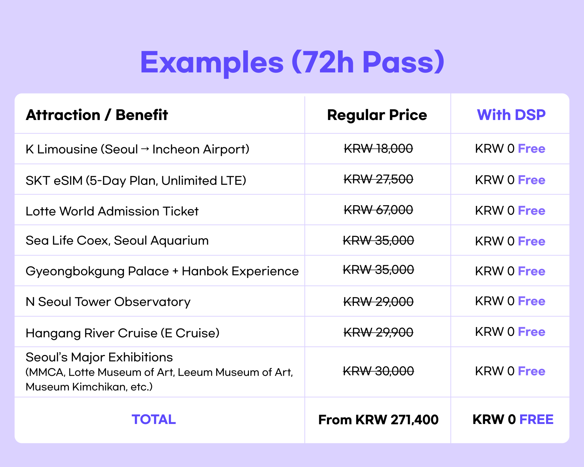- 2. Free admission more than 50 major attractions in Seoul including Lotte World, Hangang Cruise!