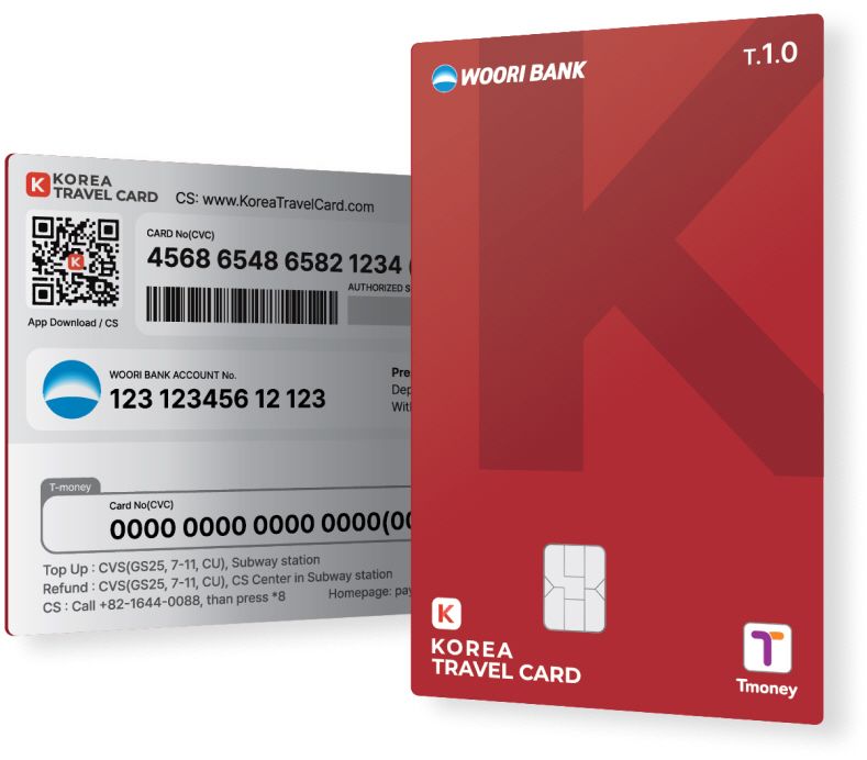 韓国代表銀行カードで安全に全国500万店舗で支払いができるKOREA TRAVEL CARD! 韓国到着後、仁川空港のウリィ銀行で安全にカードを受け取りましょう。最適な為替レートで両替から入金まで一度に解決してください! KOREA TRAVEL CARDは、ハナカードカードネットワークを使用して、韓国どこでもお支払いいただけます。 交通カード 全国バス、ソウル/済州市シティツアーバス、空港リムジン(仁川国際空港-ソウル/京畿/仁川圏運行) 全国地下鉄(コーレイルの方針により、一部地域内のサービスが制限される場合があります。) 全国タクシー KTX-セマウル-ムグンファITX青春-Nuriroなど 全国の高速バスターミナル 全国の韓国道路公社料金所、民間料金所(一部道路を除く) *交通残高は、地下鉄の交通カードチャージ端末またはコンビ(CU、GS25、7-11)でチャージできます。 簡単な入金(チャージ) どこでも、好きなだけ 空港の銀行、両替所、コンビ、キオスク、アプリによるオンラインチャージ!! ZERO手数料 入金手数料、支払い手数料なしで、ウリィ銀行の入金時の手数料はZERO! 韓国到着後、空港のウリィ銀行で最適な為替レートで両替し、手数料なしで入金いただけます。 ハナカードカードネットワークを使用して、全国どこでも手数料なしでお支払いができます。 無制限のキャッシュバック&特典 パートナーショップで最大50%キャッシュバック・割引 毎回お支払い時に0.2%無制限キャッシュバック Google予約サービス 全国10,000以上のパートナー店予約サービス提供 *受け取り場所 1. 仁川国際空港第1ターミナル(1F公共エリア) 6番ゲート付近|06:00~22:00 11番ゲート付近|06:00~22:00 B1東側ウリィ銀行支店|09:00~16:00 2. 仁川国際空港第2ターミナル(1階公共エリア) 7番ゲート付近|06:00~22:00 B1東側ウリィ銀行支店|09:00 - 16:00 3. 済州ダウンタウン マネーボックス済州支店|10:00~21:00 場所: 済州特別自治道 済州市 原老衡4キル 1, 1階102号 4. 金海国際空港 マネーボックス両替所金海空港店|06:00~21:00 場所: 金海空港駅(釜山-金海軽電鉄)1階待合所