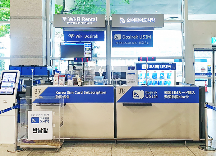 - 入境大厅正中央处旁即可看见"WifiDosirak"摊位,出示凭证后可立刻领取。(7, 8号出入口前面)
