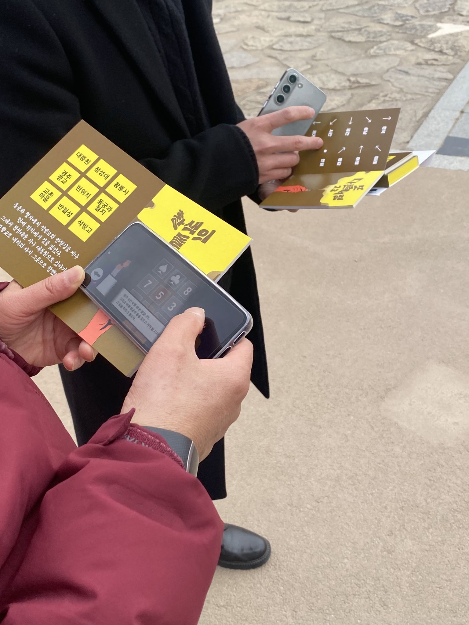 Using both a printed kit and a mobile interface, participants follow a mission-based route that guides them through key heritage sites such as Donggung Palace, Wolji Pond, and Woljeonggyo Bridge.