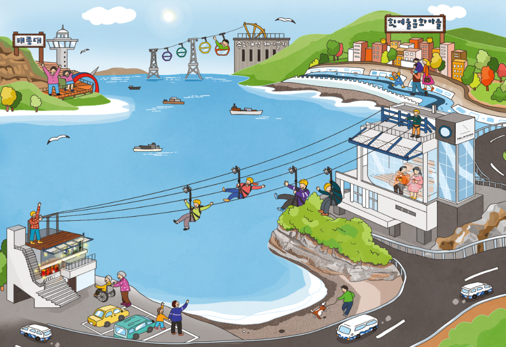 穿过一望无际的釜山大海飞向天空的惊心动魄的体验! 在充满蓝色的高空飞索太宗台制造特别的回忆吧。