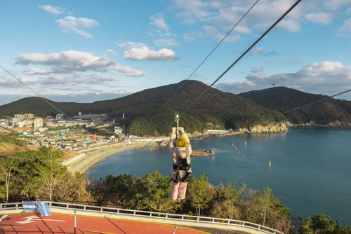 因为可以一口气滑下653米的距离,可以一起享受,因此更有趣的高空飞索太宗台。